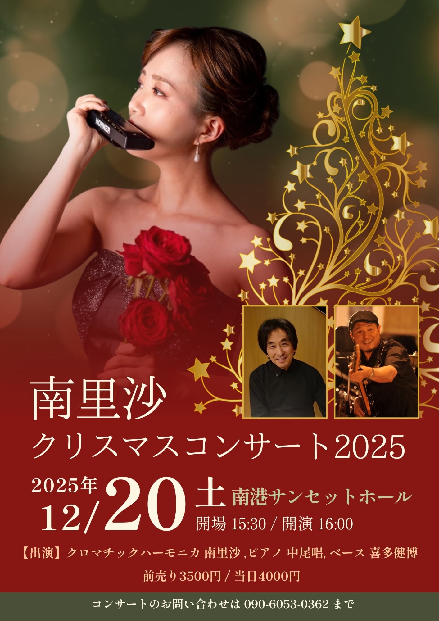 2025年12月20日(土) 開場15:30 開演16:00 大阪・南港サンセットホール[全席自由席] 前売り 3500円 / 当日 4000円 出演:クロマチックハーモニカ 南里沙 / ピアノ 中尾唱 / ベース 喜多健博